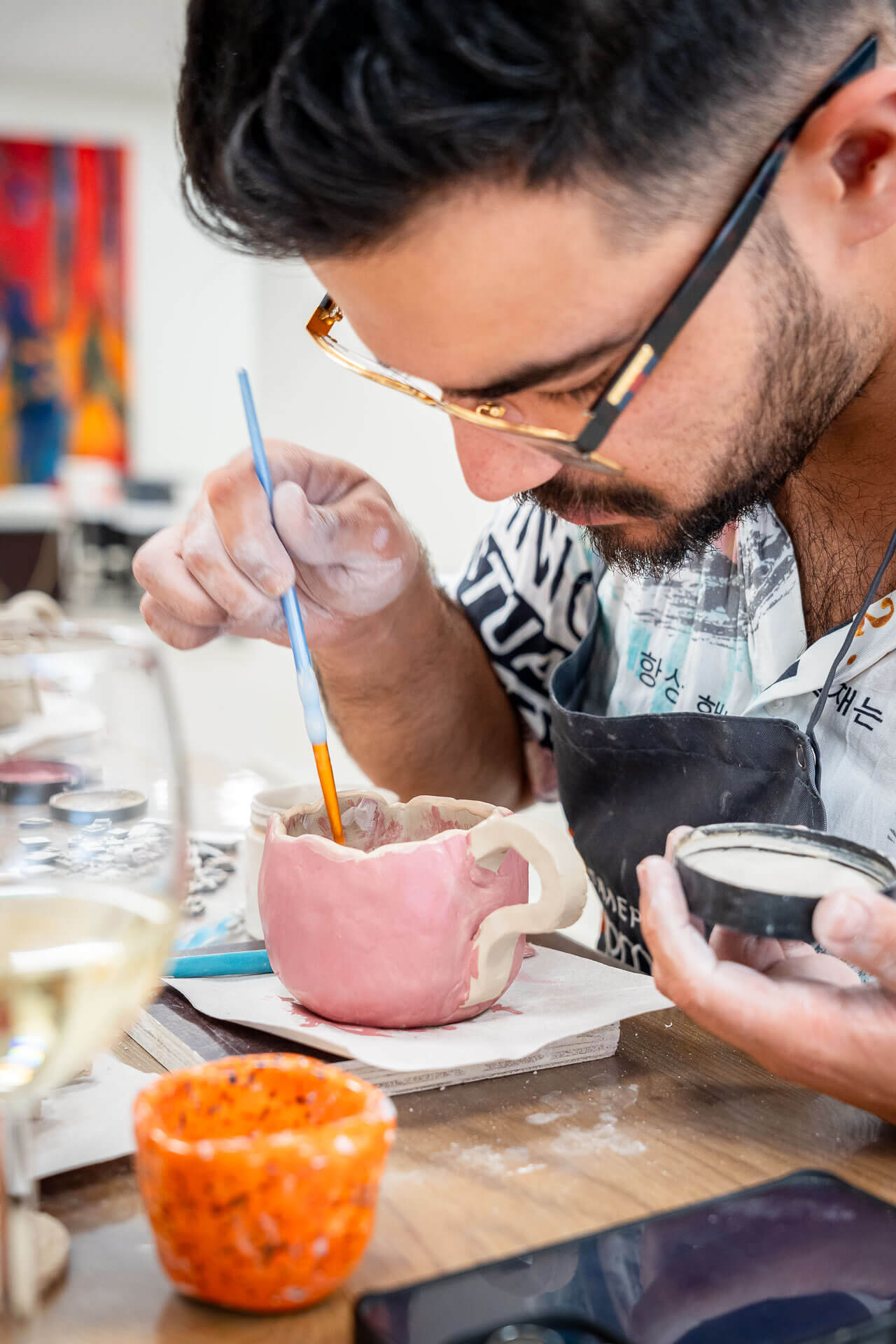 Докато работиш по своята чаша, можеш да се отпуснеш с чаша вино, сок, кафе или чай.